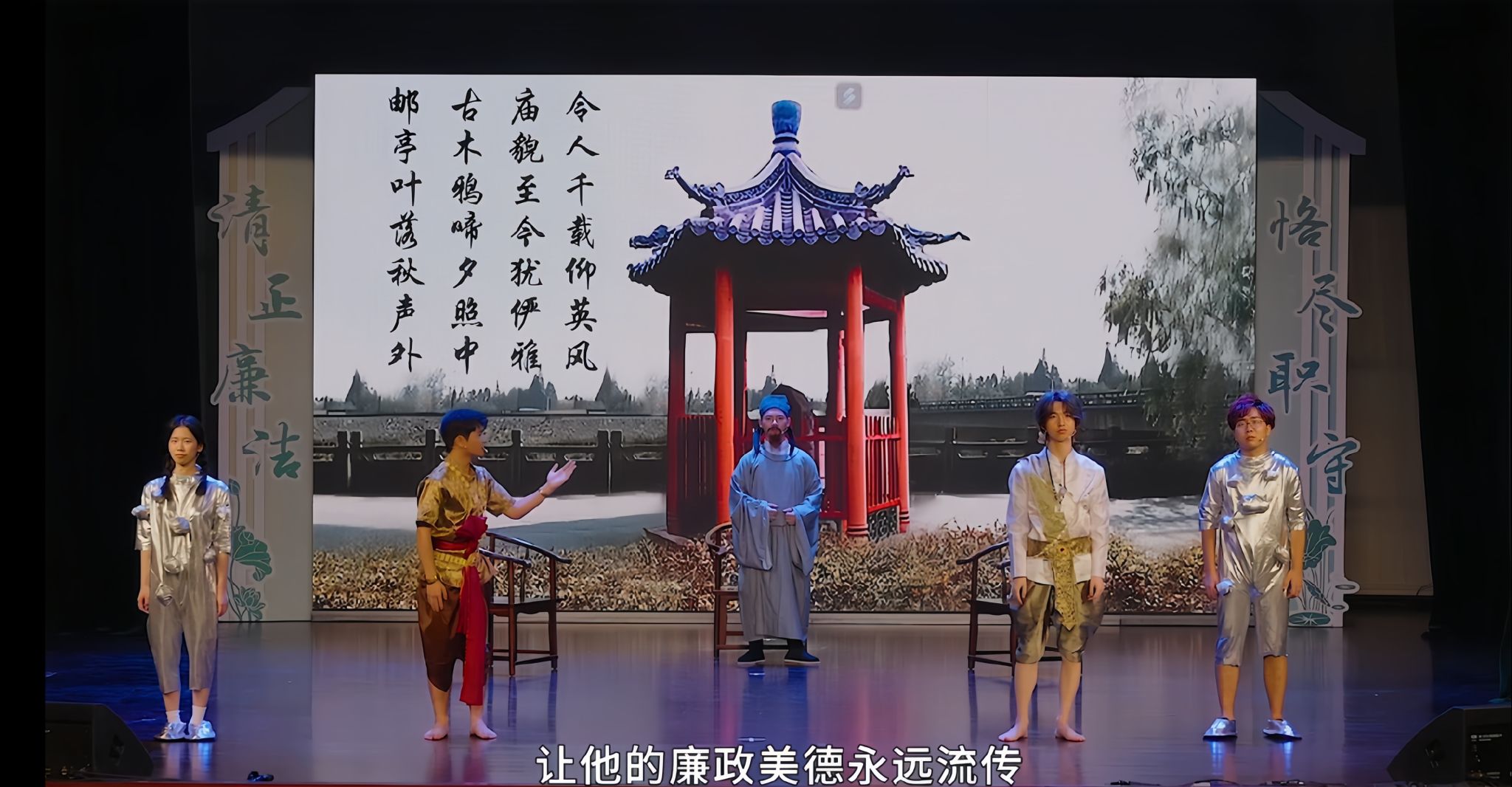 廉洁小品《却金千载仰英风》,立足东莞全国重点文物保护单位“却金亭碑”历史,通过创意改编、现代小品演绎的方式,再现了明代时期中泰通商交往中,东莞官员“却金守廉”的精神内核。小品以我校泰国留学生来华学习为引子,穿插泰国学生“穿越”明朝,亲历东莞官员拒绝暹罗商人酬金的桥段,展现了中国廉政文化源远流长的历史传统。小品于2024年获教育部评为第九届高校廉洁教育系列活动全国优秀作品。