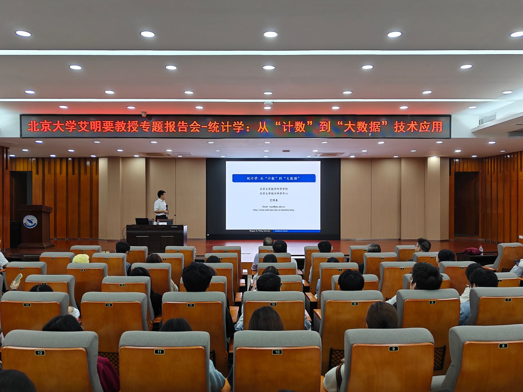 12月22日下午,北京大学二级教授、著名统计学家艾明要教授应邀来校,作题为“统计学:从‘计数’到‘大数据’技术应用”的专题学术报告。校党委副书记、校长贺定修出席报告会,报告会由科研处处长陈俞强主持。我校人工智能学院、商学院(筹)、通识学院(筹)相关专业200余名师生代表到场聆听。