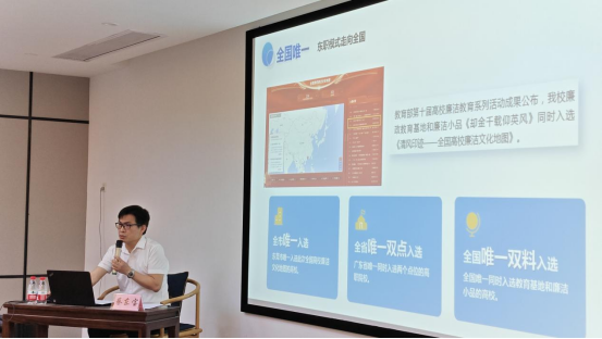 脚下有力,见证东职实践。 蔡东宝副书记回顾学校廉洁文化建设足迹:2023年廉政教育基地与清风园揭牌,获《南方日报》报道;2024年廉洁小品《却金千载仰英风》获评教育部全国优秀作品;2025年学校双入选教育部《清风印迹——全国高校廉洁文化地图》,成为全国唯一同时入选教育基地和廉洁小品的高校,入选全国优秀作品数量位列全国高职院校第二。一年一小步,三年一大步,凝聚心血汗水。