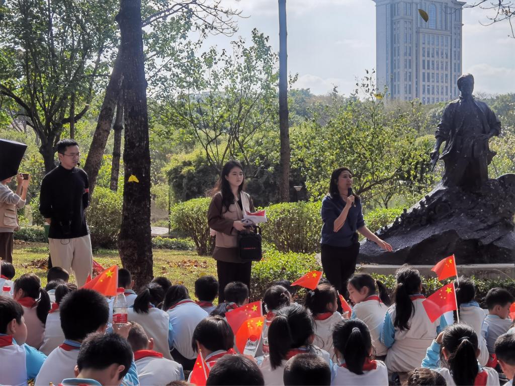活动还特别设计了“红色寻宝”环节。孩子们根据收到的问题小卡片在公园内的红色宣传栏和雕塑介绍中寻找答案。现场气氛热烈,学生们在游戏中主动接受红色文化教育,增强了参与感和获得感。最后,全体师生进行《没有共产党就没有新中国》的大合唱。