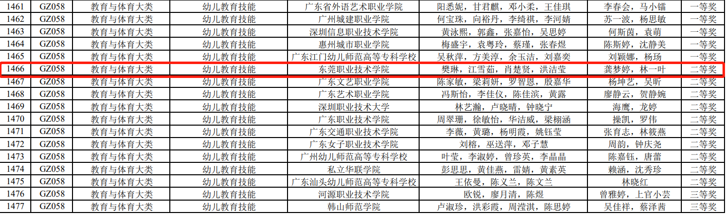 近日,2024-2025学年广东省职业院校技能大赛(高职组)幼儿教育技能赛项结果公示,我校学前教育专业学生樊琳、肖楚贤、江雪茹、洪洁莹组成的参赛队伍,在龚梦婷、林一叶两位教师的悉心指导下,经过激烈角逐,最终从全省51支参赛队伍中脱颖而出,荣获团体二等奖。