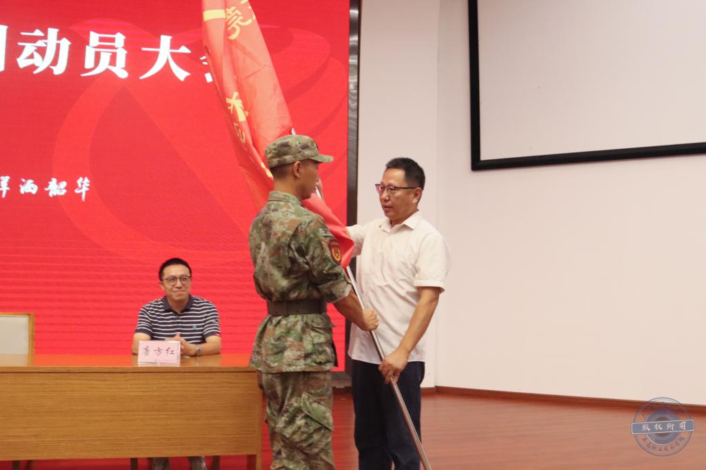 动员讲话结束后,大会进入授旗环节。院长范四立手持鲜红的营旗,郑重将“第二营” 营旗授予军训营代表。飘扬的营旗不仅承载着学院对2025级新生的殷切期许,更象征着军训任务的正式交接,也让全体新生感受到了身为“第二营”一员的责任与荣光。