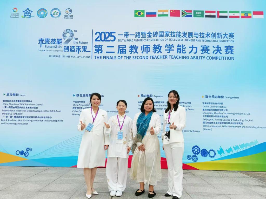 11月14日,2025年“一带一路”暨金砖国家技能发展与技术创新大赛之第二届教师教学能力赛全国决赛在广东省珠海城市职业技术学院落幕。我校教育与体育学院(筹)社区管理与服务专业由刘淑娴、袁美芝、洪明心、刘思四位老师组成的参赛团队,在社会和个人服务赛道的激烈角逐中表现优异,凭借扎实的教学功底、创新的教学设计和出色的现场展示,最终斩获银奖,充分展现了我校教师的教学风采与专业素养。