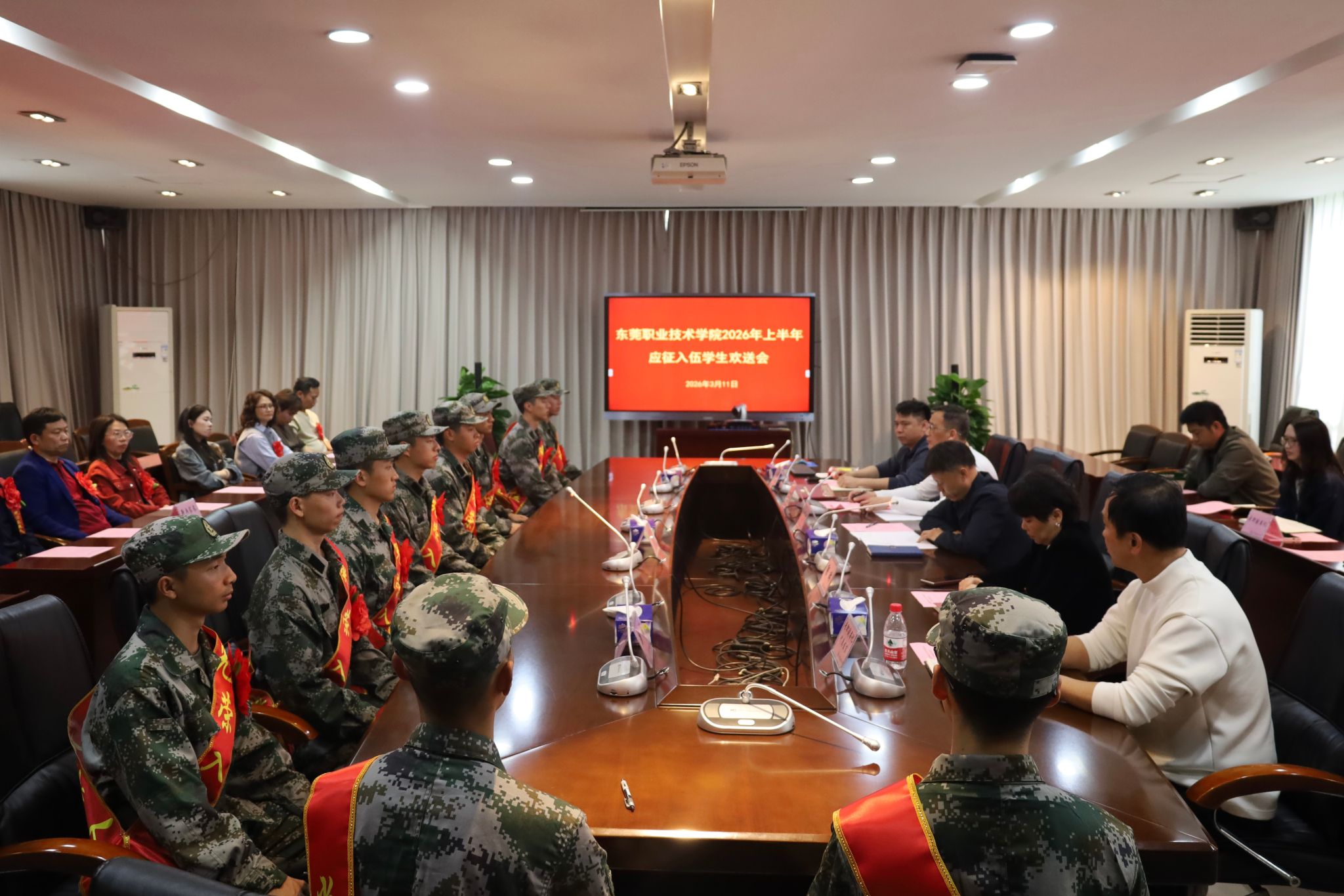 3月11日下午,学校在立德楼B415会议室举行2026年上半年应征入伍学生欢送会。欢送会由学校保卫处副处长、武装部副部长赖学林主持,学生处、保卫处(武装部)等部门相关人员,相关二级学院专职副书记及入伍学生和家长参加了欢送会。