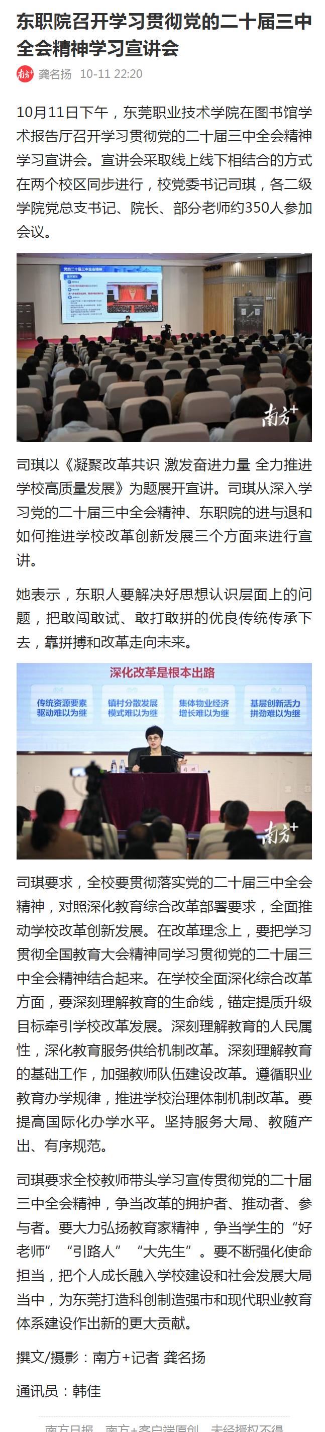 【南方+】东职院召开学习贯彻党的二十届三中全会精神宣讲会