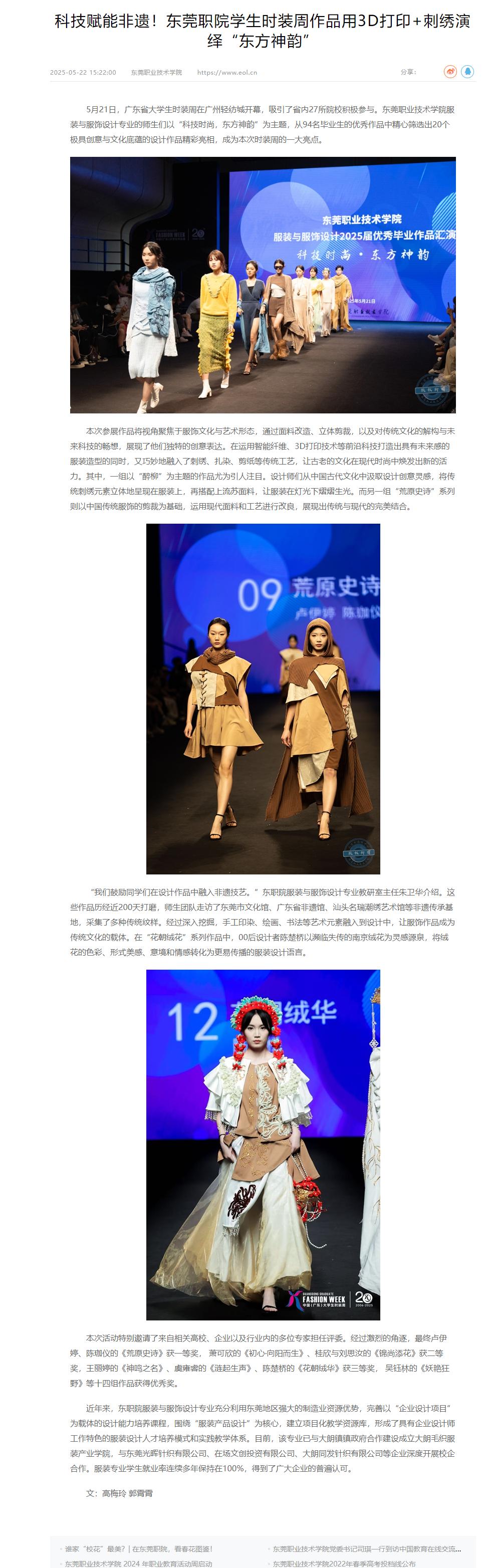 【中国教育在线】科技赋能非遗!东莞职院学生时装周作品用3D打印+刺绣演绎“东方神韵”