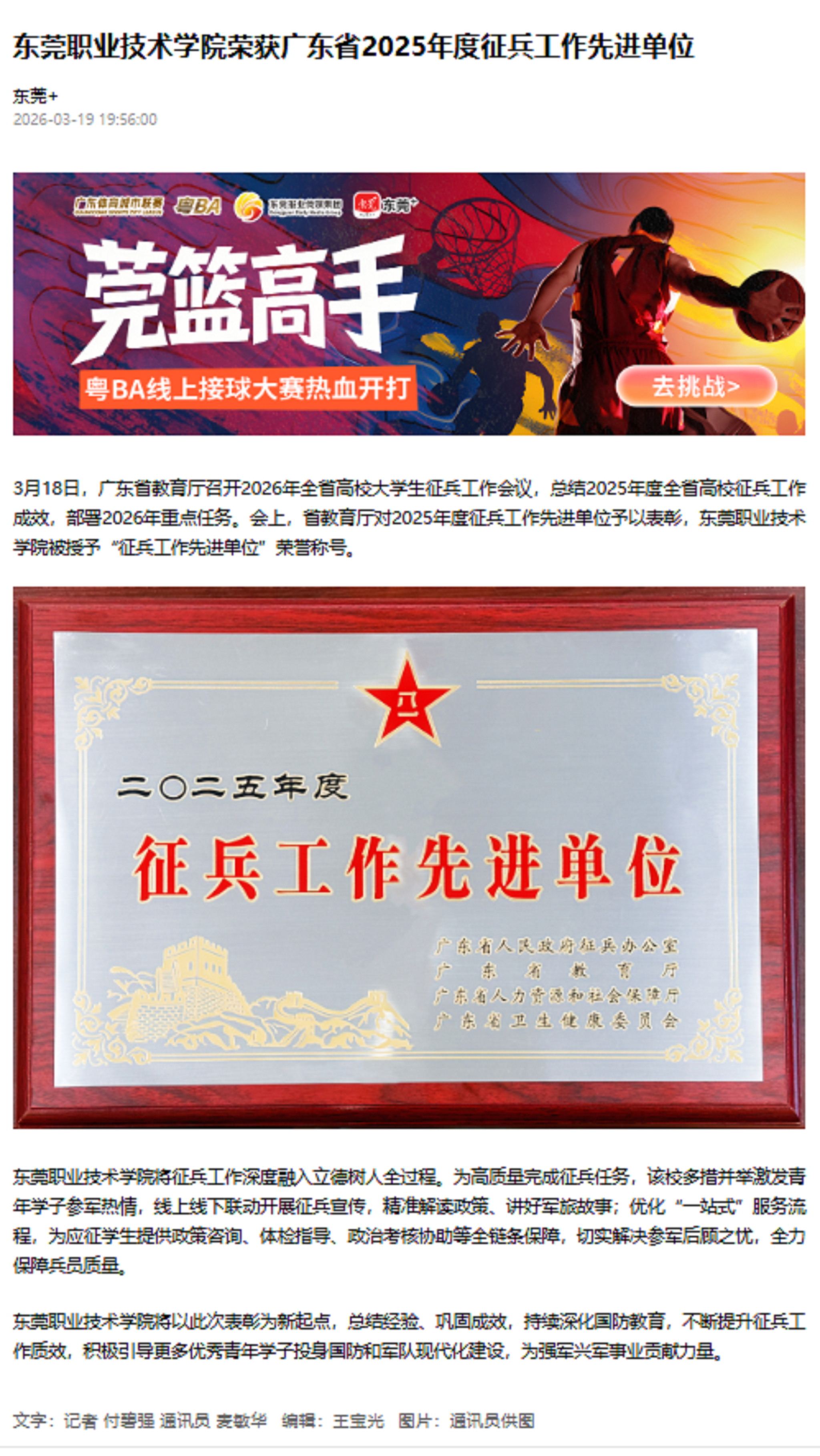 【东莞+】东莞职业技术学院荣获广东省2025年度征兵工作先进单位