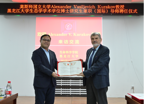 亚历山大·瓦西里耶维奇·库拉克夫教授对能够受邀来到黑龙江大学表示诚挚感谢,表示很荣幸受聘黑龙江大学客座教授和黑龙江大学生态学学术学位博士研究生兼职(国际)导师,本次交流访问是双方友好合作的一个新的开始,期待在黑龙江大学进行深入的学术交流活动,未来将努力为黑龙江大学生态学学科的发展做出积极贡献,强化团队合作,在土壤生态学和真菌学等领域进行更深层次的合作与交流,共同助力黑龙江大学实现“双一流”高水平大学建设的宏伟目标。