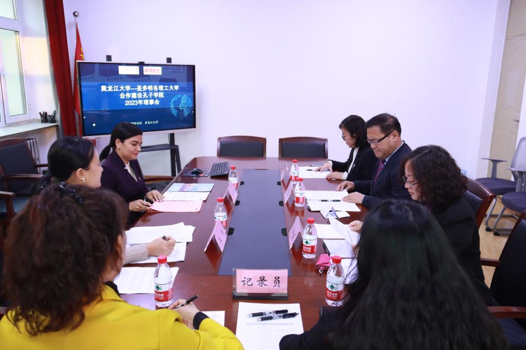 12月11日下午,黑龙江大学—圣多明各理工大学合作建设孔子学院2023年理事会在国际合作与交流处3220会议室举行。副校长井立强、圣多明各理工大学孔子学院外方院长瓦妮莎·维多利亚·罗伯乐斯·孔德雷拉、黑龙江大学国际交流合作处、国际文化教育学院、西语学院、圣多明各理工大学孔子学院相关负责同志出席会议,会议由国际交流合作处处长、国际文化教育学院院长孙秋花主持。