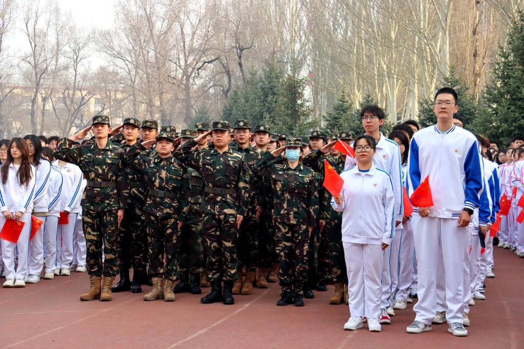 7时整,校国旗护卫队迈着整齐的步伐护送着五星红旗走向旗杆,校学生军乐团演奏《义勇军进行曲》,熠熠晨光中,全体师生注视着五星红旗冉冉升起,肃立齐唱国歌。