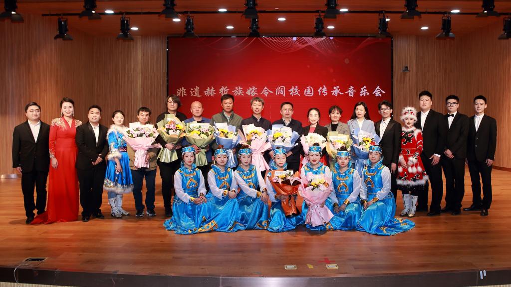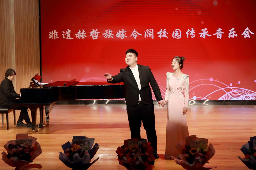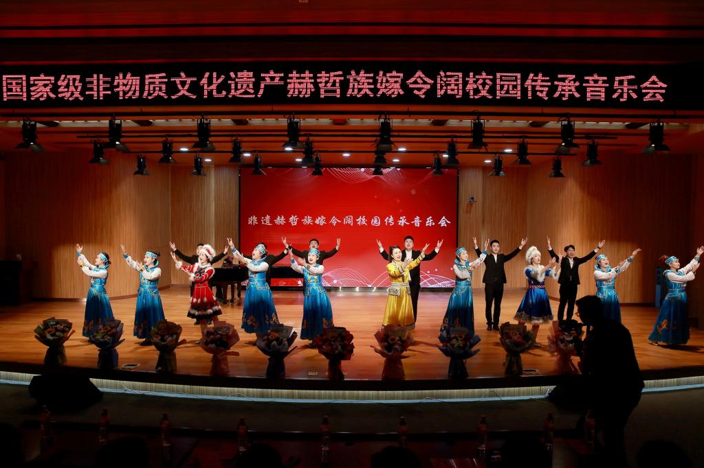 为进一步弘扬中华优秀传统文化,铸牢中华民族共同体意识,激发爱国情怀,加强国家级非物质文化遗产赫哲族嫁令阔音乐的挖掘、保护和传承,弘扬龙江本土特色非遗音乐,5月15日晚,我校在三号楼地下报告厅举办非遗赫哲族嫁令阔校园传承音乐会。本次音乐会由艺术学院赫哲族嫁令阔研学基地主办,艺术学院音乐系教授李萃琳带领的非遗赫哲族嫁令阔传承创新团队参演。校党委副书记李君明,校党委宣传部、艺术学院相关同志、嫩江市前进镇人民政府相关同志参加音乐会。