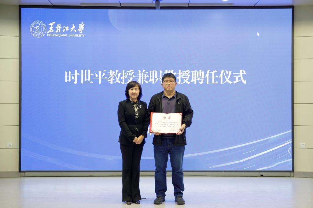 聘任仪式上,于文秀介绍了时世平教授的学术声誉及学术科研贡献等情况,并为时世平教授颁发黑龙江大学中国语言文学兼职教授聘书。