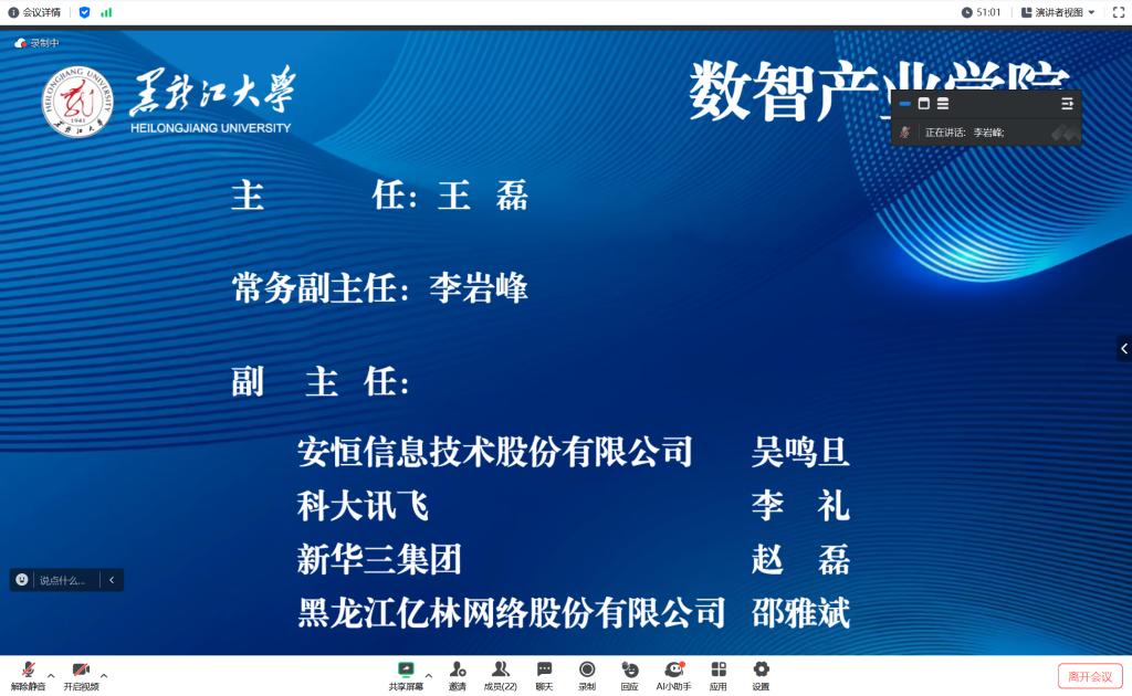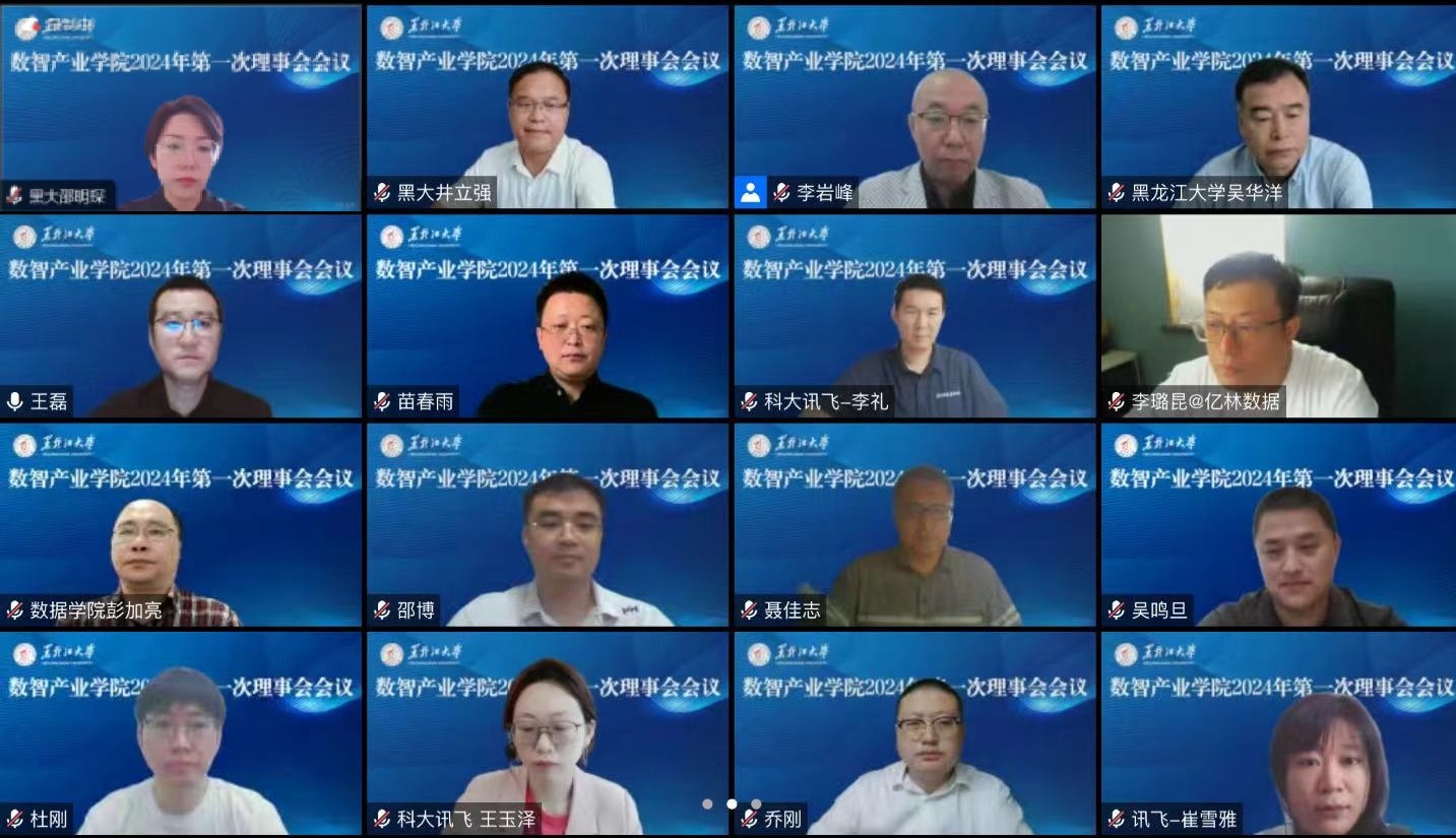 为推进我校数智产业学院高质量发展,6月14日上午,数智产业学院2024年第一次理事会会议在线上召开。数智产业学院理事长、副校长井立强出席会议并致辞,杭州安恒信息技术股份有限公司、科大讯飞股份有限公司、新华三集团、黑龙江亿林网络股份有限公司主要负责人、我校教务处相关负责同志、数智产业学院教学指导委员会委员参加会议,会议由数智产业学院教学指导委员会主任、数据科学与技术学院院长王磊主持。