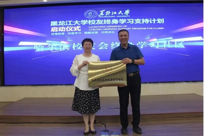 王敬波向“哈尔滨校友会终身学习社区”授牌,徐忠平代表哈尔滨校友会接受母校授牌。