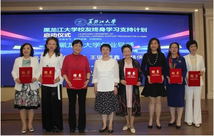 王敬波向赵晓红,徐忠平,关大冶,陈嘉,赵蕴华,岳海南颁发“黑龙江大学校友导师”聘书;向仲兆敏、隋熙凤、吕晶、王琚、范鑫、时伟侠、韦敏芳颁发“黑龙江大学创业导师”聘书。