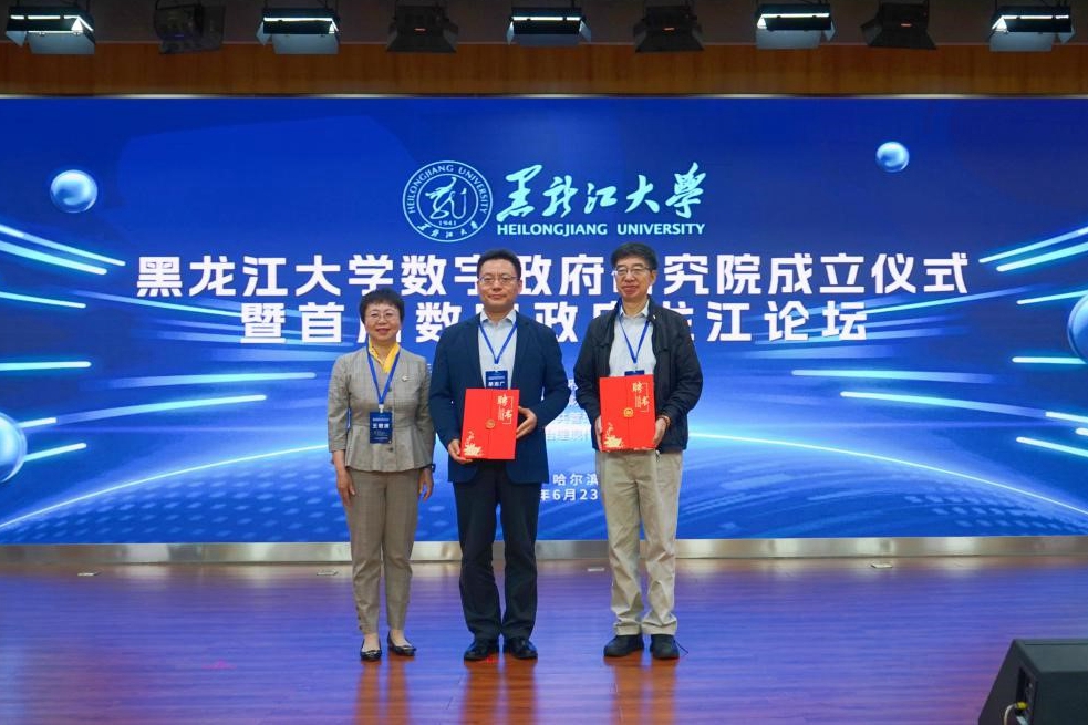 6月23日,黑龙江大学数字政府研究院成立仪式暨首届数字政府龙江论坛在主楼一楼报告厅举行。国家信息中心信息化和产业发展部主任单志广,黑龙江省工业和信息化厅一级巡视员官英敏,校党委书记迟宝旭,校长王敬波,黑龙江省科学技术厅二级巡视员王喜林,黑龙江省营商环境建设监督局党组成员、省政务大数据中心主任张海军,黑龙江省机关事务管理局副局长王威武,黑龙江省数据局副局长王秀锋,绥化市委常委、市人民政府副市长陈国彬,清华大学计算社会科学与国家治理实验室执行主任、黑龙江大学数字政府研究院学术委员会主任孟庆国,黑龙江大学数字政府研究院名誉院长何颖,上海报业集团财联社副总编辑王全宝以及来自国内知名高校的专家学者,省内期刊代表,学校相关职能部门主要负责同志和政府管理学院师生200余人参加成立仪式。黑龙江大学政府管理学院院长、数字政府研究院院长袁洪英主持成立仪式。