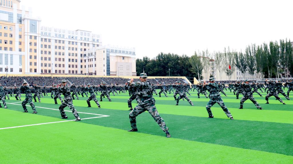 在军训科目展示环节,退役大学生士兵协会进行了军事特色项目表演;电子工程学院200名男同学组成的表演方队进行了军训科目擒敌拳表演。