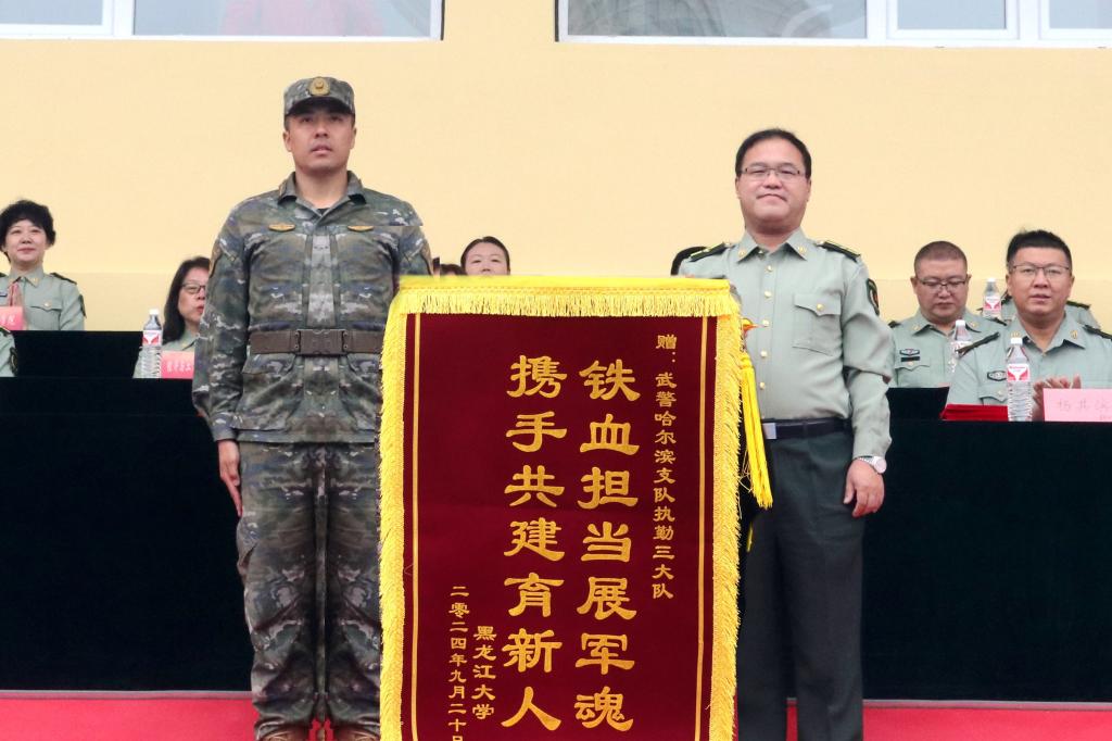 副校长、军训师师长井立强代表学校向承训单位武警哈尔滨支队赠送锦旗。