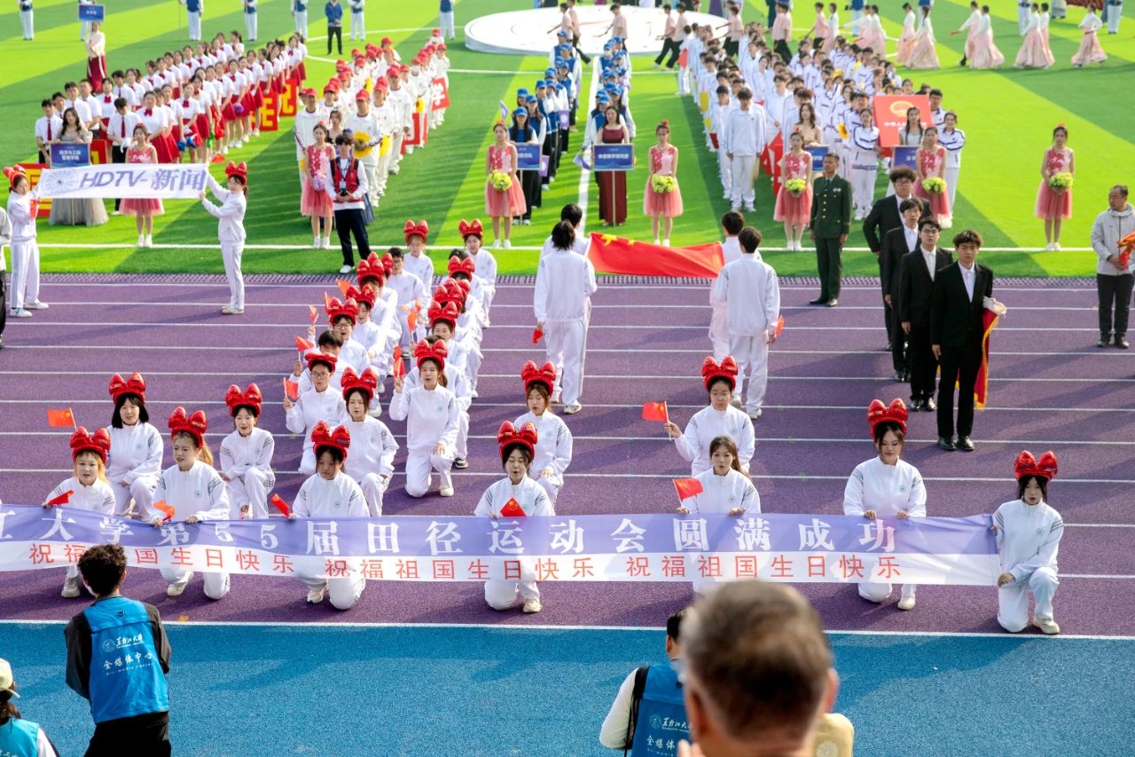 伴随着激昂的音乐,全校各单位运动员代表方队在国旗护卫队、花束队、刀旗队的引导下有序进入会场并接受检阅。他们队列整齐,精神抖擞,以铿锵有力的步伐、高亢嘹亮的口号充分展现出广大学子朝气蓬勃的青春活力与团结奋进的精神风貌。