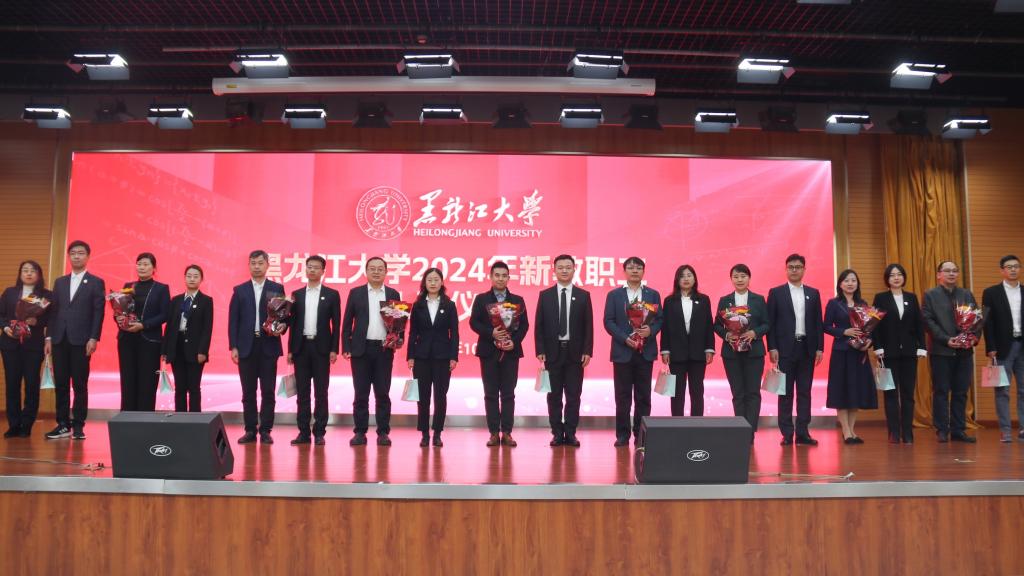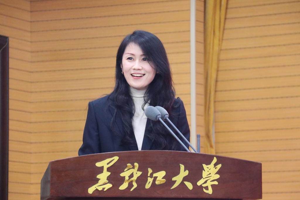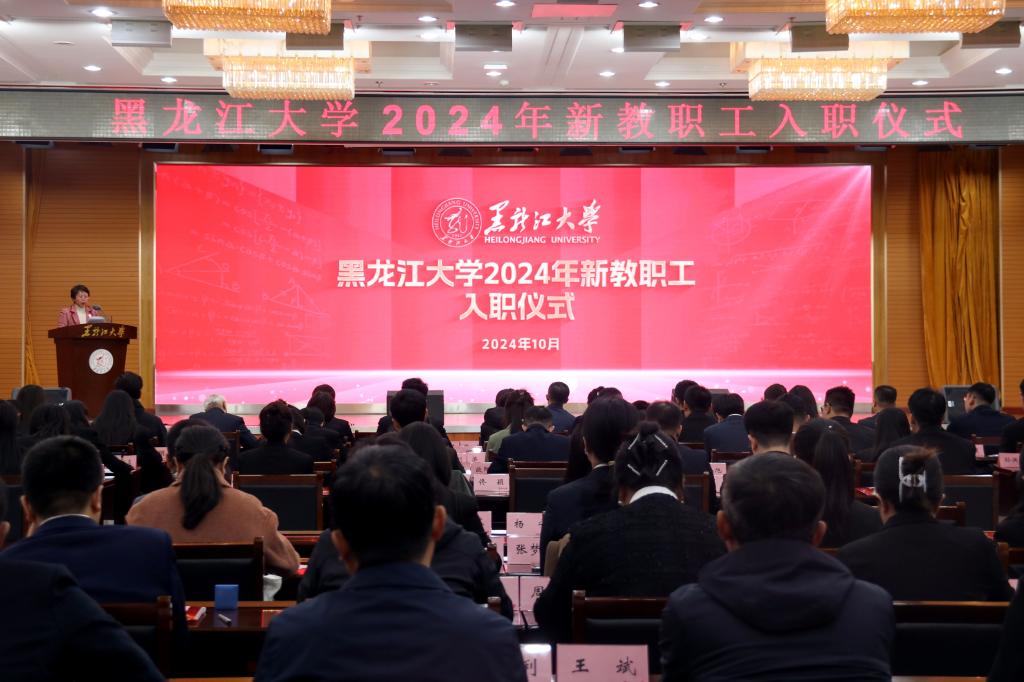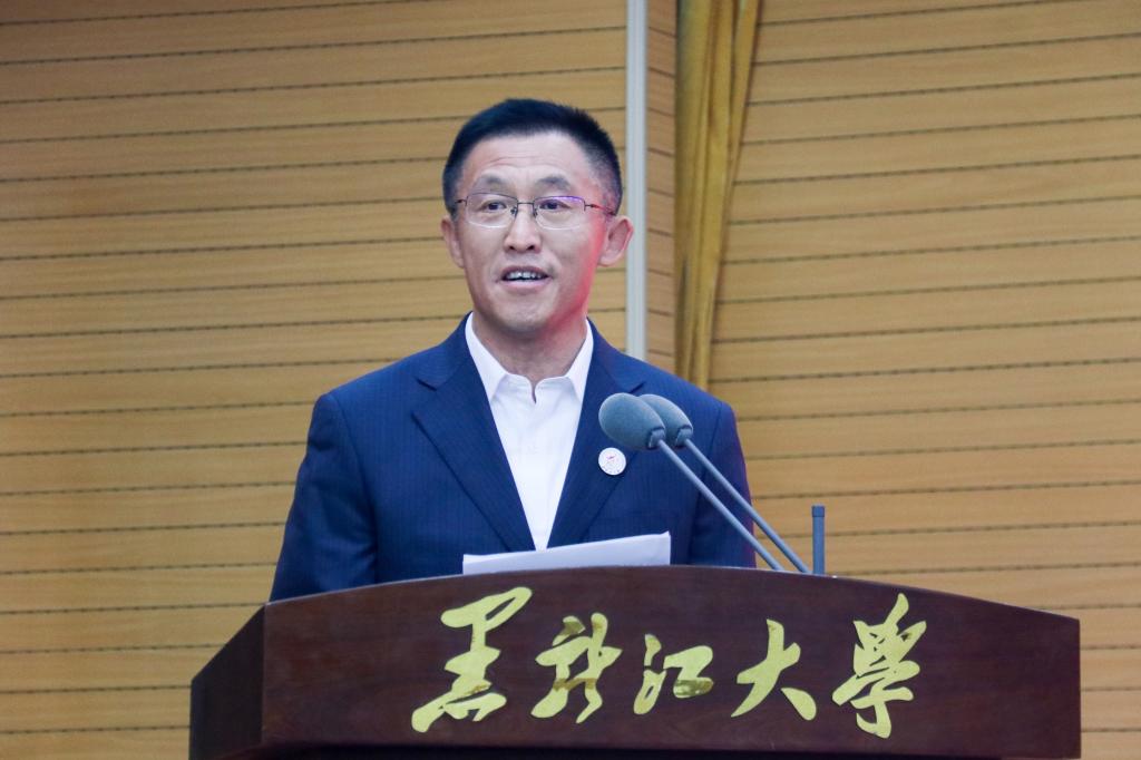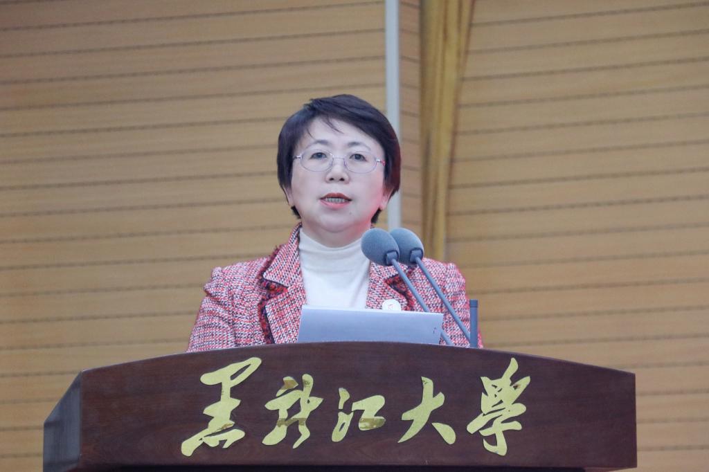 校长王敬波致辞。她代表学校向全体新教职工表示热烈的欢迎和美好的祝福。为帮助新教职工更好地了解学校,王敬波从三方面介绍了“黑大印象”:一是黑大有红色基因,有家国情怀,有不断坚守的行稳致远、弦歌不辍的价值追求。历经83年艰难求索,学校始终与国家民族命运休戚与共,未来学校将继续履行历史责任,肩负时代使命;二是黑大有良师大家,有勇毅学子,有不断积淀的躬耕不辍、追求卓越的意志品格。学校坚守为党育人、为国育才的初心使命,黑大教师也始终以“择一事,终一生”的职业操守和工匠精神,发挥自身最大的力量与能量;三是黑大有人文气息,有自由气质,有不断蕴蓄的尊师重教、崇智尚学的精神家园。学校坚持人才强校战略,为建设专业化高素质教师队伍布局谋篇,形成了“人人皆可成才、人人尽展其才、人人享受尊重”的蔚然校风。王敬波表示,全体新教职工既要做传道授业解惑的教书匠,还要做用心用情用爱的管理者,更要做学生为学为事为人的大先生。希望新教职工在黑龙江大学的“大舞台”演绎“大梦想”,成就更美好的自己,收获更精彩的人生。