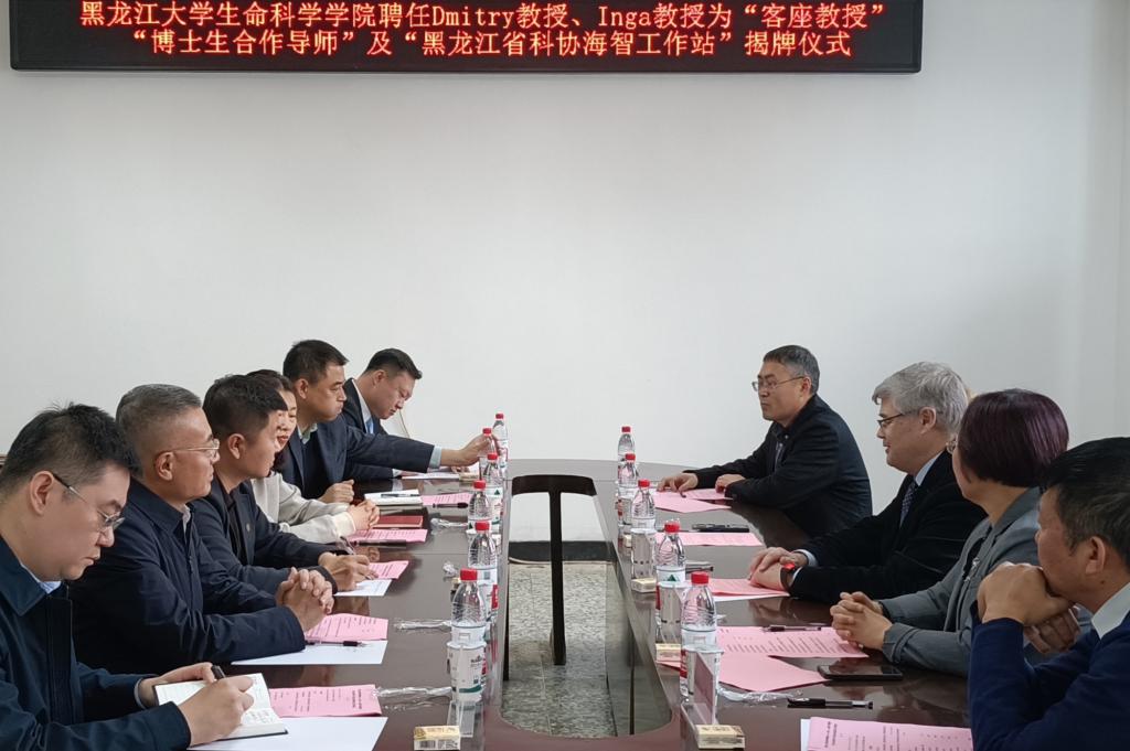 10月23日下午,在我校生物楼315会议室举行俄罗斯科学院通讯院士、俄罗斯科学院西伯利亚分院、俄罗斯新西伯利亚国立大学自然科学系Dmitry Olegovich Zharkov教授,俄罗斯科学院西伯利亚分院、俄罗斯新西伯利亚国立大学自然科学系Inga Grin教授为“客座教授”“博士生合作导师”聘任仪式暨“黑龙江省科协海智工作站”揭牌仪式。副校长李卓、人事处、重点建设与发展工作处、科学技术处、研究生院、生命科学学院相关负责同志及教师代表出席该仪式。生命科学学院院长李海英主持仪式。