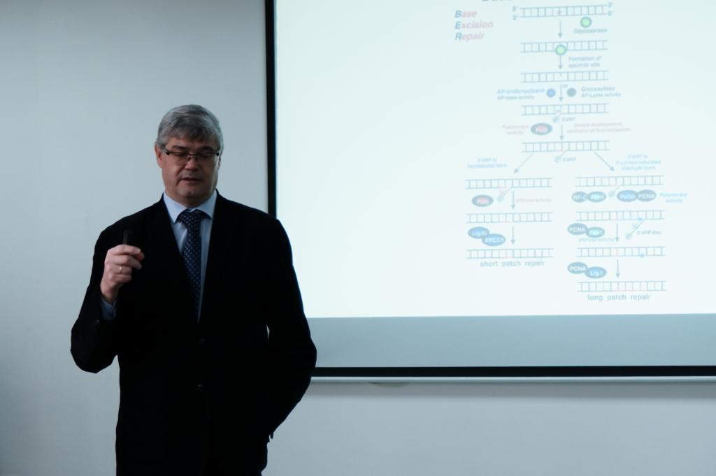 聘任仪式后,在生命科学学院院长李海英教授的主持下,Dmitry Olegovich Zharkov教授作了精彩的题为《Structural biology of DNA repair: from prokaryotes and people to plants》的学术报告,并与学院师生进行互动交流,报告全面介绍了DNA在细胞中自发或在各种物理和化学因素的影响下发生损伤及原核生物、人类到植物中都有各种DNA修复酶参与损伤修复等方面的重要进展。(生命科学学院供稿)