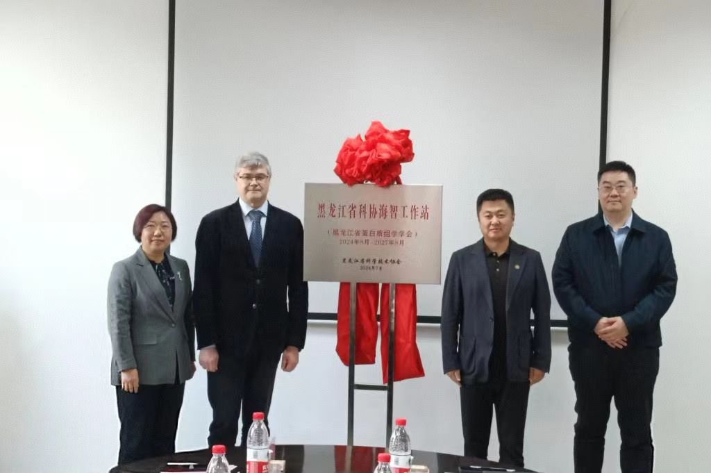 副校长李卓、Dmitry Olegovich Zharkov教授、科学技术处副处长沈中辉、黑龙江省蛋白质组学学会理事长李海英共同为黑龙江省科协海智工作站揭牌。