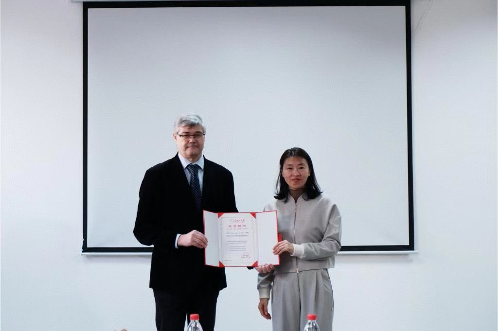 仪式上,人事处处长张晶平代表为Dmitry Olegovich Zharkov教授、Inga Grin教授颁发黑龙江大学“客座教授”聘书。