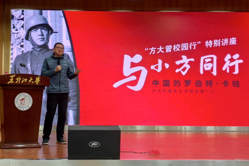 刘凤影在主持讲座时表示,方大曾作为一名战地记者,以手中的笔和相机为武器,与全国的青年人一道投身于战争之中,唤起国人抗战激情,是人民的英雄。冯雪松先生作为业界工作者,具有当代新闻人认真负责的职业精神、专业素养和深切情怀,通过多年的努力探索,引发人们对重要新闻历史人物的关注。希望黑大学子能够发扬方大曾坚强、无私的高尚精神,并提倡与会师生向冯雪松先生学习,为国家、为民族、为新闻史、为新闻事业贡献力量,承担起新时代青年人的责任与使命。(摄影:孙晟伟 梁嵋茜 刘俊文;摄像:刘浩然)