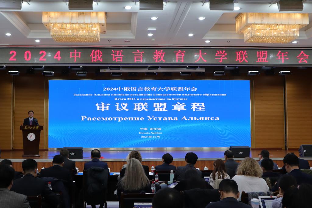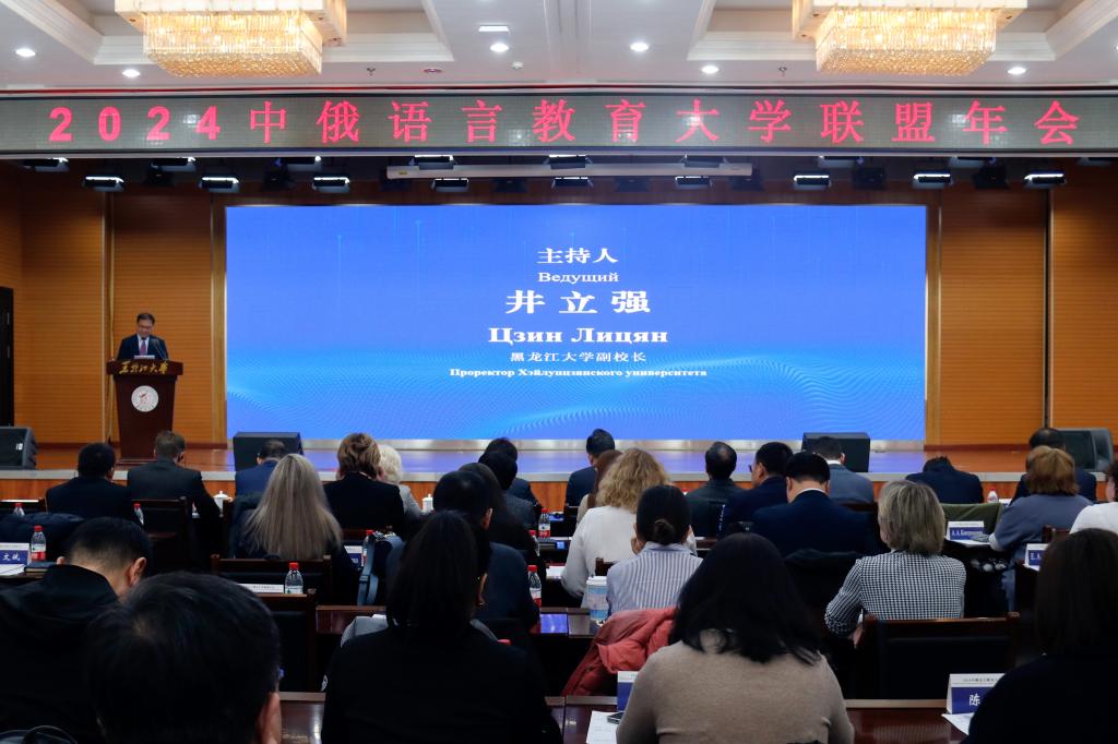12月11日上午,2024中俄语言教育大学联盟年会在黑龙江大学主楼一楼报告厅召开。黑龙江省教育厅副厅长曹叠峰,莫斯科国立语言大学第一副校长佩特鲁恰克,西伯利亚联邦大学副校长韦尔哈韦茨,坦波夫国立大学副校长古谢夫,黑龙江大学校长王敬波,北京第二外国语学院校长计金标,广东外语外贸大学副校长刘建达,延边大学副校长张学武,贵州师范大学副校长乙引,以及中俄双方30余所高校100余名代表出席会议。本次会议由黑龙江大学副校长井立强主持。