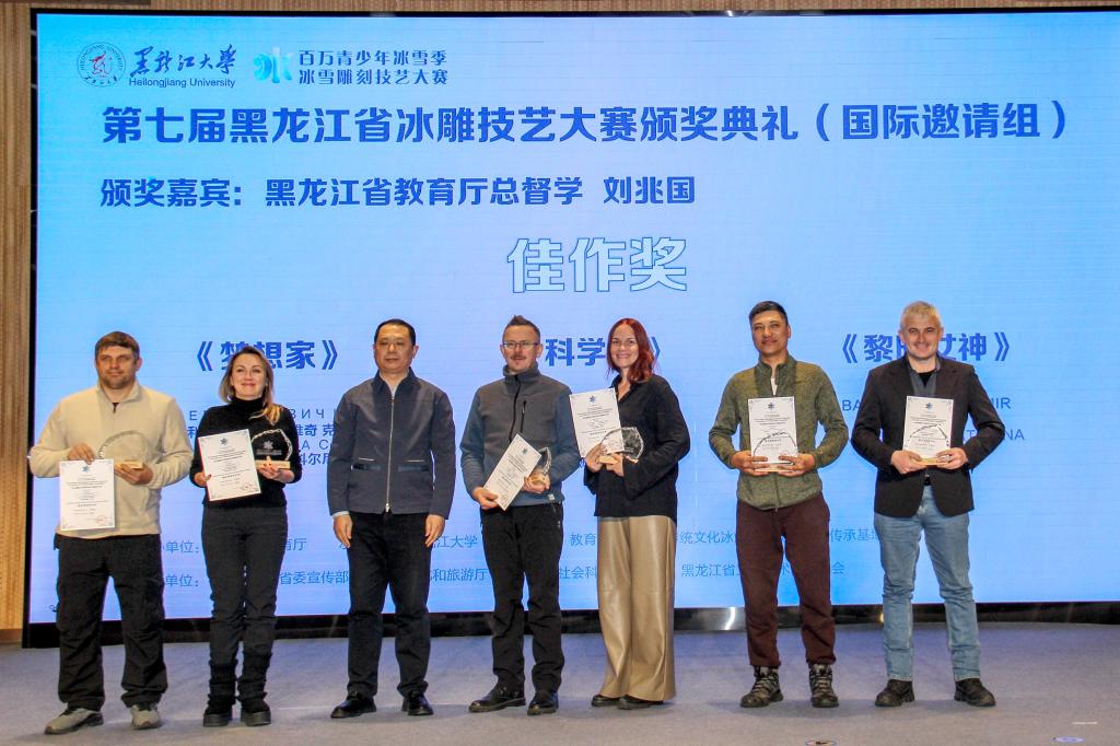 李卓致闭幕辞。他表示,在本次赛事中,我们欣赏了来自全国各地的优秀学子、优秀教师以及国际朋友们在冰雪雕刻技艺领域展现的卓越成就,也共同见证了“黑龙江省冰雪景观雕刻人才培养基地”的成立。未来,黑龙江大学将以此为契机,整合国内外优质资源,改革专业、拓展培训,打造集赛事交流、文化推广、产业智库于一体的综合平台,继续探索冰雪文化全球传播的新路径,为冰雪产业迈向更高水平贡献智慧与力量。(摄影:于珊珊)