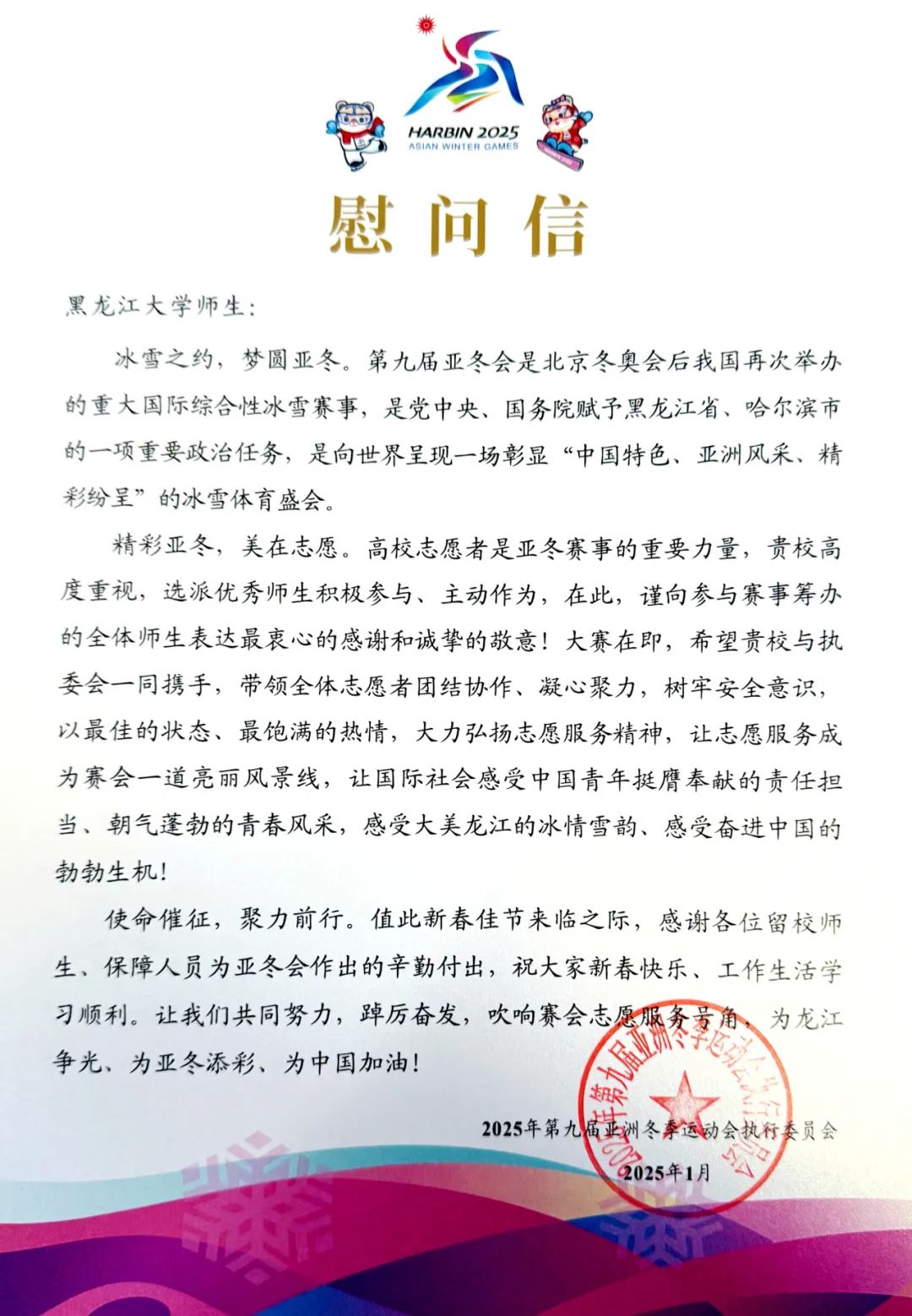 张金丰首先向全体师生致以节日的问候,对我校志愿者保障工作给予高度评价,并代表亚冬会执委会向黑龙江大学致感谢信,感谢我校在亚冬会保障工作中的突出贡献。 张金丰一行来到志愿者寝室,与志愿者们进行了亲切地交流,询问志愿者们近期的志愿服务情况以及生活情况。他强调,志愿者们作为赛事顺利进行的重要保障力量,肩负着光荣而重要的使命,希望志愿者们要以哈尔滨亚冬会为契机,高质量完成各项志愿服务工作,用实际行动展现青春作为,为亚冬盛会贡献青年力量。