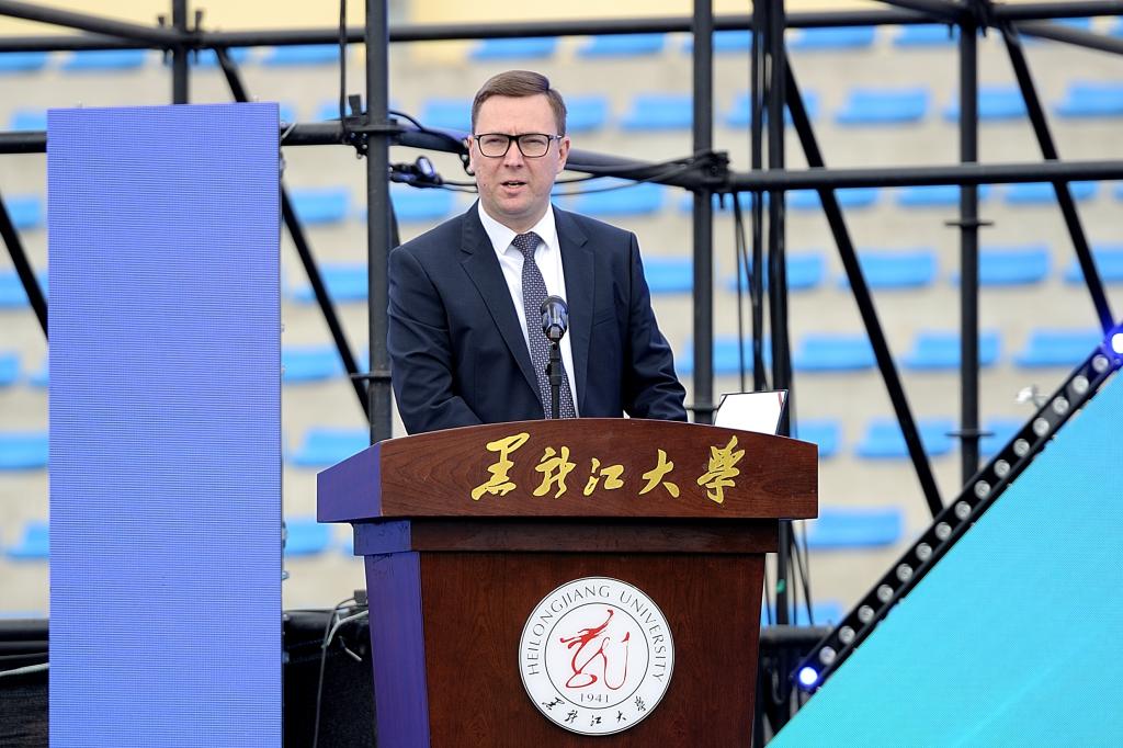 斯凯顶奢・亚历山大在致辞中高度评价了黑龙江大学在中俄教育合作中发挥的重要作用,期待以此次活动为契机,进一步增进中俄青年之间的友好往来,深化两国在文化、教育领域的交流与合作。