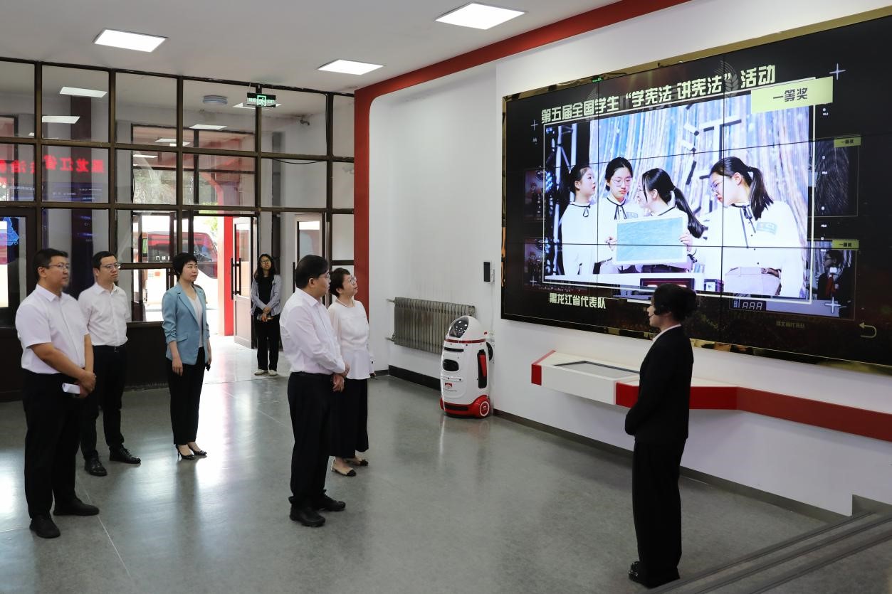 在黑龙江省青少年学生法治教育实践基地,张文斌一行依次参观了序厅、宪法仪式厅、宪法教育区、宪法体验区、法治文化厅,现场体验了人工智能、虚拟现实等技术应用,现场感受了情景模拟、案例展示等互动模式。张文斌充分肯定了基地的沉浸式教育与创新实践成果。