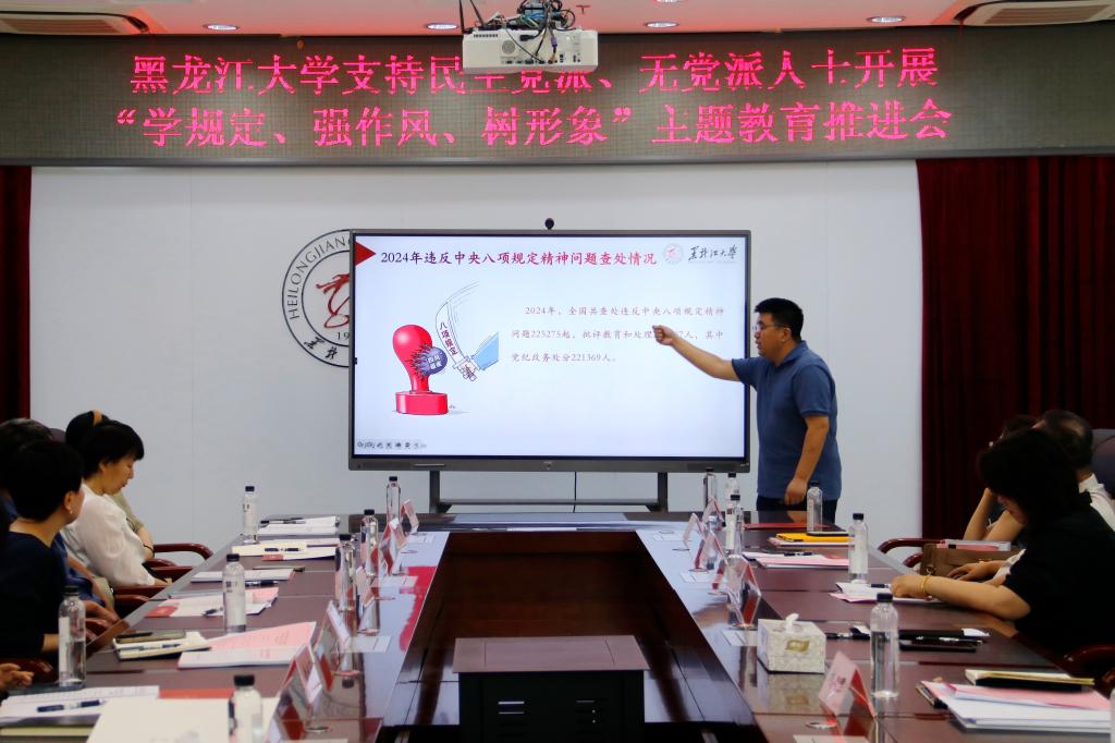 会议集体学习了习近平总书记关于深入贯彻中央八项规定精神学习教育的重要讲话和重要指示精神,传达了《黑龙江大学关于支持各民主党派、无党派人士开展“学规定、强作风、树形象”主题教育的实施方案》。