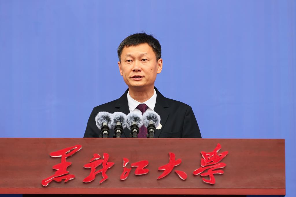 机电工程学院2025级电气工程及其自动化专业本科生汪飞扬代表新生发言。他向师长和父母表达感谢,并分享了入校以来迎新、集体生日会以及军训生活的暖心体验。他号召全体新生要以“博学慎思,参天尽物”的校训为引领,传承抗大精神、肩负使命担当、努力追逐梦想,共同书写新时代黑大青年的青春答卷。