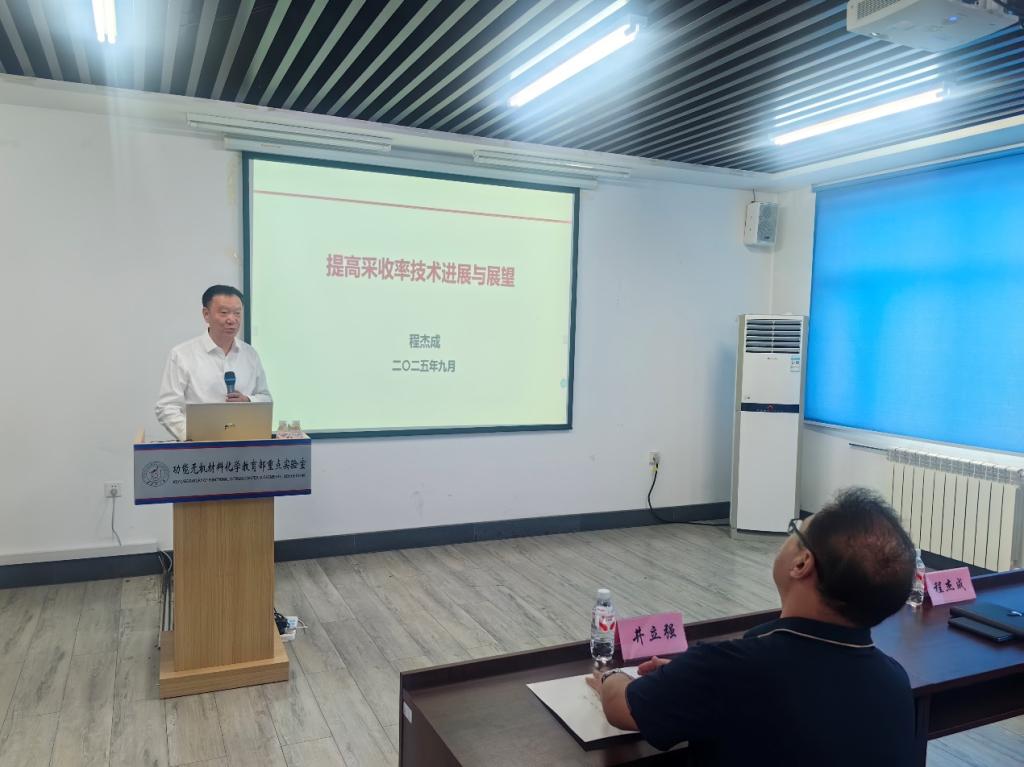 会前,程杰成到无机功能材料化学教育部重点实验室进行实地走访调研,详细了解了重点实验室在平台建设、科研成果、社会服务等方面的基本情况。随后,程杰成为化学化工与材料学院师生做题为“提高采收率技术进展与展望”的学术讲座。报告由校党委常委、副校长井立强主持,他对程杰成院士回访母校表示热烈欢迎,并对其为化学化工与材料学院师生作学术报告及指导工作表示诚挚感谢。程杰成在报告中从提高原油采收率的必要性、大庆油田主要提高采收率技术成果、大庆油田提高采收率技术攻关方向三个方面,系统阐述了聚合物驱、三元复合驱、泡沫复合驱等化学驱提高原油采收率相关技术研究和工程实践,详细介绍了大庆油田CCUS技术创新与工业化应用开展情况,同时提出相关技术应用中仍存在的问题。
