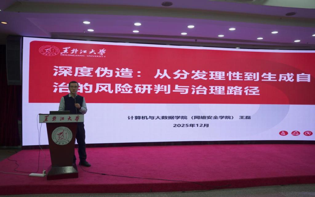 黑龙江大学计算机与大数据学院(网络安全学院)王磊教授以《深度伪造:从分发理性到生成自治的风险研判与治理路径》为题,就深度伪造技术在内容分发机制变革中的风险与挑战进行交流,并从技术与法律协同治理的角度分享了未来AI内容安全体系的构建思路。