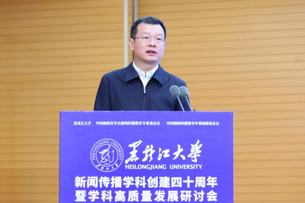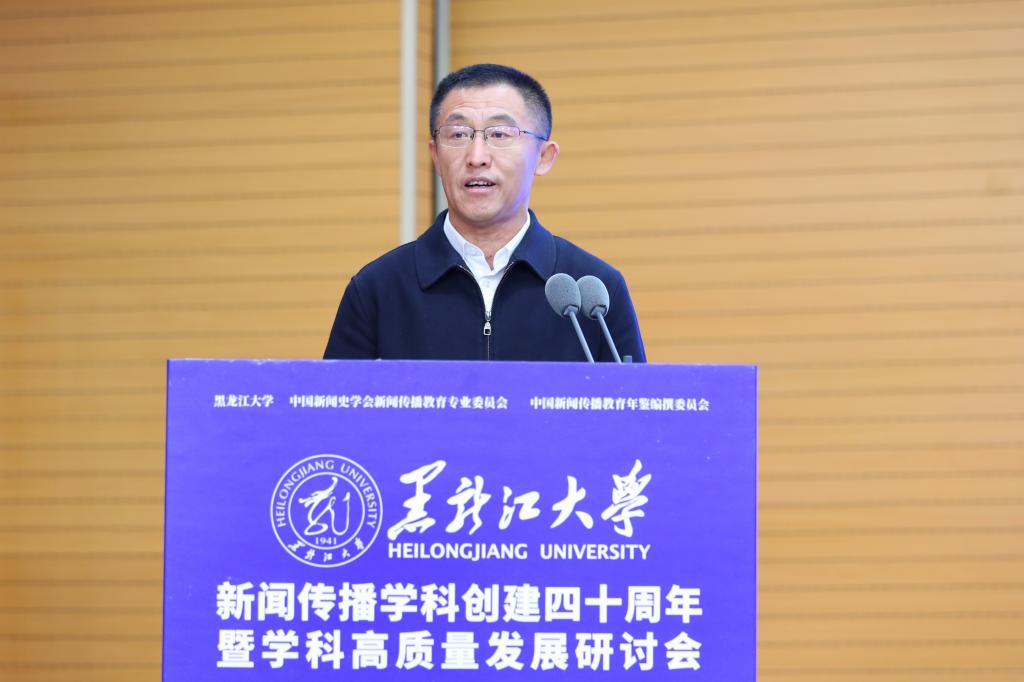 黑龙江省委宣传部副部长徐大勇致辞。他表示,黑龙江大学新闻传播学科深耕黑龙江省主流思想舆论构建,主动践行服务龙江社会发展的使命担当。希望与会专家学者以时代视野深入研讨交流,为全媒体信息化大背景下的新闻传播教育献计献策,共同做好新形势下的新闻舆论工作。