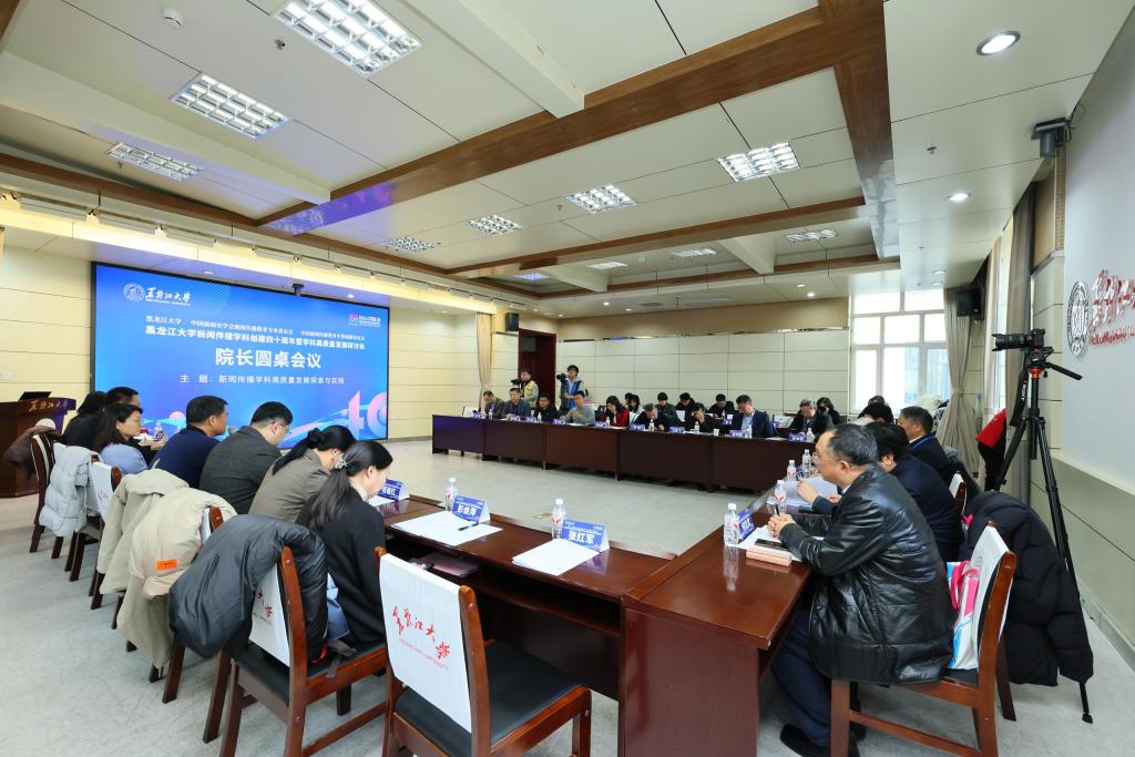 西北大学、中央民族大学、河南大学、中国地质大学、吉林大学、南京大学、华中科技大学、上海交通大学、北京体育大学、郑州师范学院、海南大学、新疆大学、江西师范大学、中国人民大学、湖北大学、河北经贸大学、辽宁大学、安徽大学、中国传媒大学、河北大学等20所高校新闻传播学院院长围绕“新闻传播学科高质量发展探索与实践”这一主题召开圆桌会议。黑龙江大学新闻传播学院党委书记江瑞主持会议。