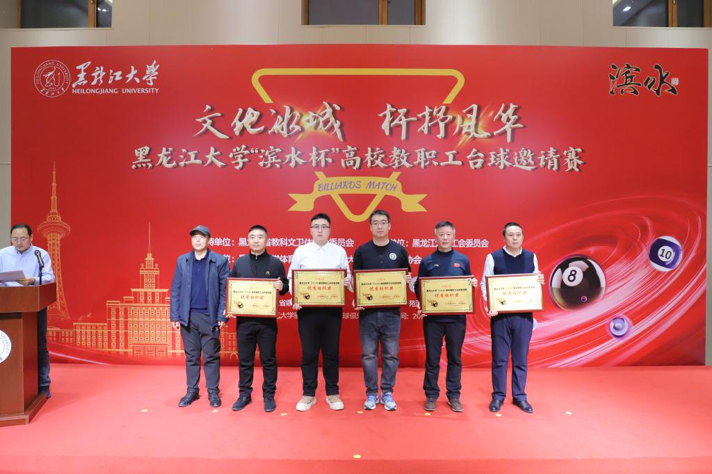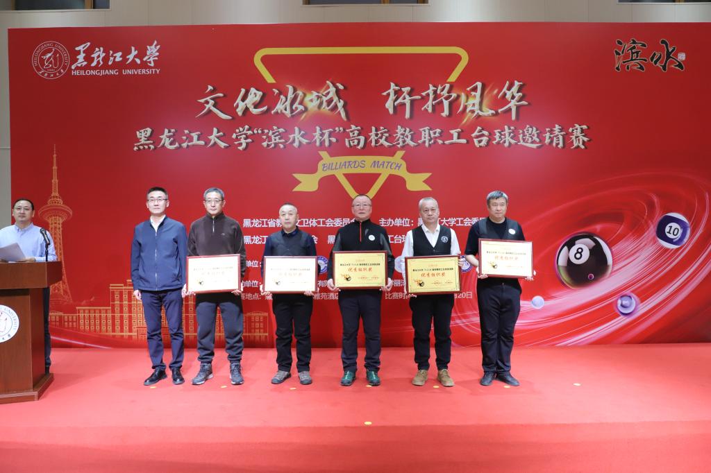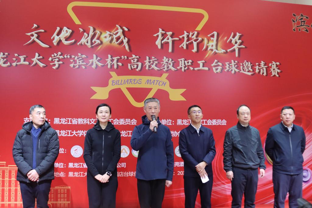 12月20日,“文化冰城 杆抒风华”黑龙江大学“滨水杯”高校教职工台球邀请赛在丽泽雅苑酒店举行。黑龙江省总工会党组成员、省教科文卫体工会主席吕光英,黑龙江大学校党委书记迟宝旭,东北农业大学党委副书记、工会主席孟炎,哈尔滨医科大学党委副书记、工会主席金焰,哈尔滨商业大学党委副书记姜国峰,哈尔滨商业大学党委常委、副校长修国英以及来自省内的10所高校教职工代表参加活动。比赛开幕式由黑龙江大学校长助理陈维厚主持。