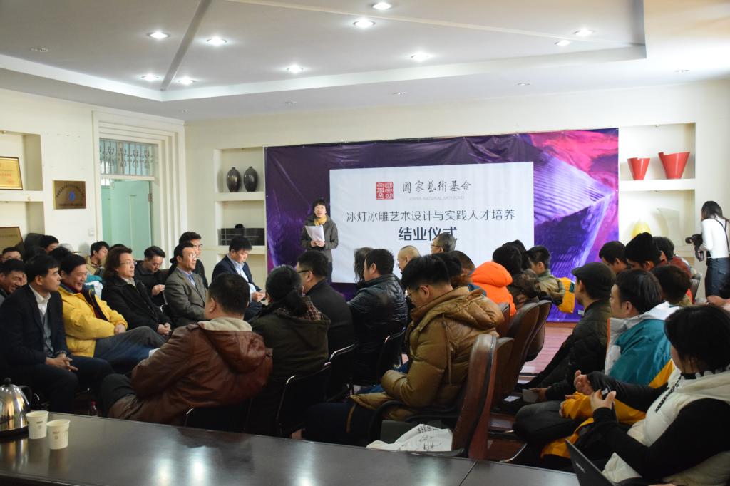 1月25日上午,“冰灯冰雕艺术设计与实践人才培养”项目结业仪式在艺术楼会议室举行。黑龙江省艺术研究院院长谭博、哈尔滨市画院院长吕滨、哈尔滨冰灯艺术博览中心副主任朱晓东、黑龙江省艺术设计协会常务副会长兼秘书长张震甫以及项目培训导师参加仪式,黑龙江大学副校长严明以及党委宣传部、教务处、艺术学院相关负责人出席仪式。