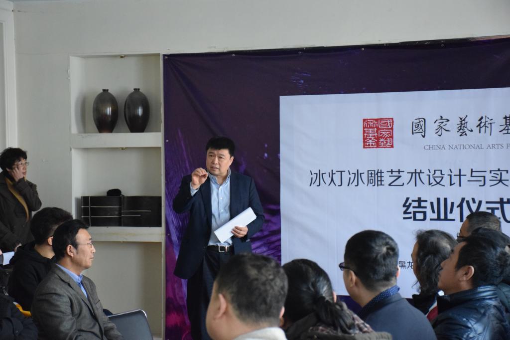 朱晓东副主任在结业式上致辞,他肯定了黑龙江大学在培养冰雪艺术人才方面的良好教学资源和环境,并希望黑龙江大学能够继续延续冰雪艺术事业,率先做好冰雪艺术教育。张震甫秘书长对培训学员的学习成果给予了肯定,他希望项目培训导师们能够培养更多的冰灯冰雕技艺传承人,并鼓励学员们在今后的冰雪事业上继续努力。吕滨院长希望学员在今后的冰灯冰雕创意设计上向国际化迈进。
