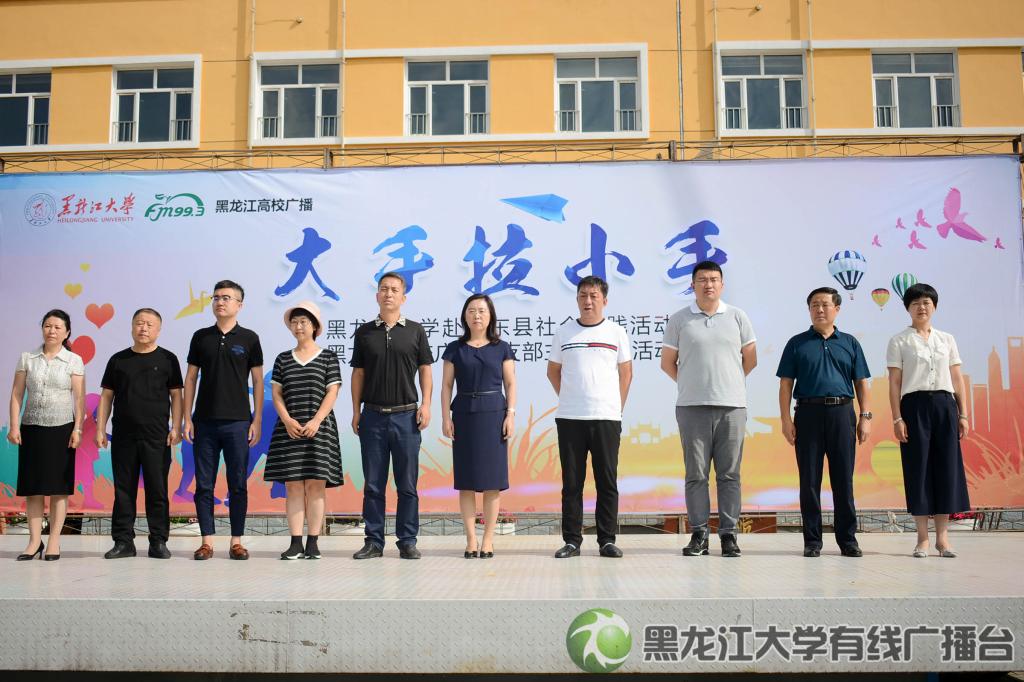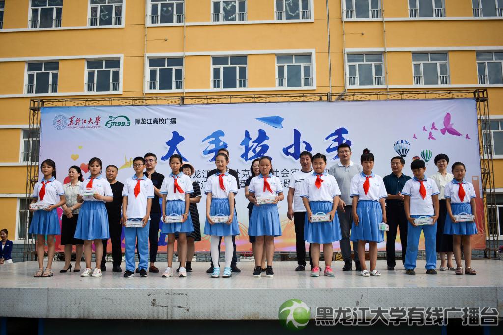 2018年7月16日上午,黑龙江大学大学生与农村留守儿童“大手拉小手”关爱活动在克东县第三小学举行。校党委副书记丁宏,克东县人民政府副县长孙志民,黑龙江高校广播总监张东新,校党委学工部部长、学生处处长李石,校团委副书记周成刚、张丹,克东县教育局局长史学谦、副局长孙文良、克东县第三小学校长韩秀妍等领导和我校的60余名志愿者及第三小学的孩子们共同参加了此次活动。
