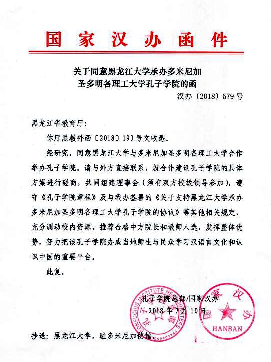 近日,我校收到汉办〔2018〕579号《关于同意黑龙江大学承办多米尼加圣多明各理工大学孔子学院的函》,孔子学院总部/国家汉办正式批准同意我校与多米尼加圣多明各理工大学合作举办孔子学院。
