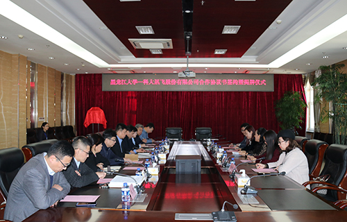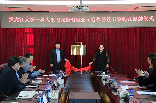 随后,签约仪式开始。科大讯飞吉龙公司总经理徐艺华与我校副校长严明签署《黑龙江大学科大讯飞股份有限公司共建黑龙江大学—科大讯飞联合实验室合作协议书》,共同为联合实验室揭牌。会后,双方代表合影留念。