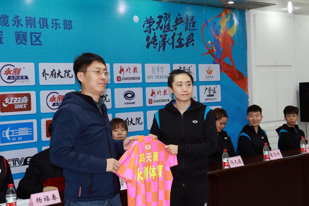 期间,河北银河体育用品有限公司董事长陈志杰向运动员代表冯天薇赠送了新赛季俱乐部球衣,爱乒紫砂执行董事戴石磊向王永刚董事长赠送了礼品。