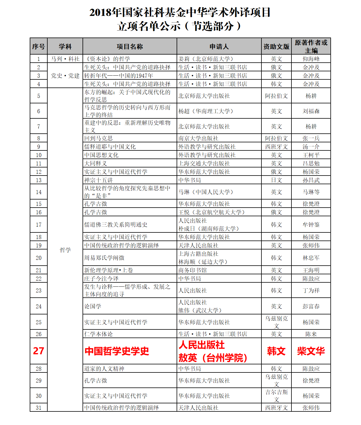 此前,我校柴文华教授的著作《中国哲学史学史》获批为2018年国家社科基金中华学术外译项目资助,资助文本为韩文,申请人为人民出版社。
