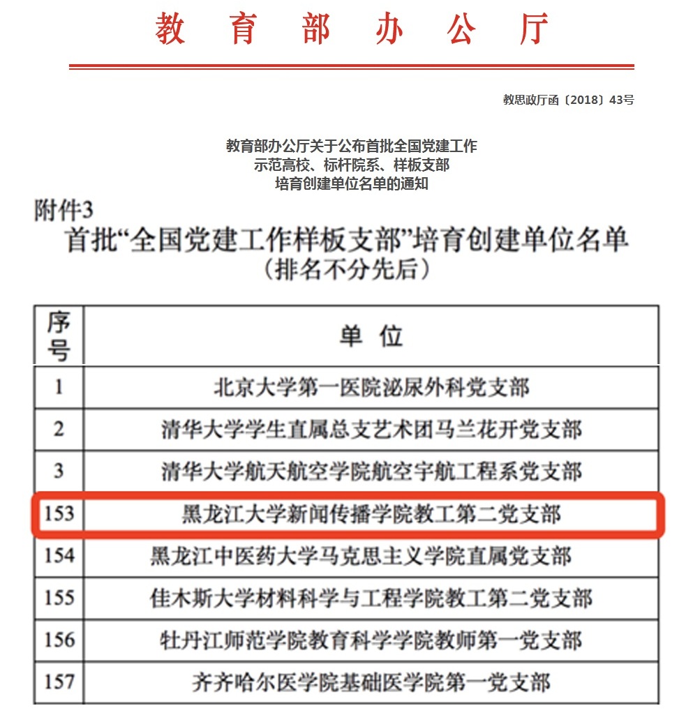 2018年是教育系统党建质量年,为写好教育“奋进之笔”,教育部面向全国高校开展了新时代高校党建示范创建和质量创优工作,计划首批培育创建10所党建工作示范高校、100个党建工作标杆院系、1000个党建工作样板支部。学校党委对照申报要求,全面梳理各二级党组织及所属党支部工作情况,从学校党委命名建设的首批15个党建示范基地中,择优推荐新闻传播学院教工第二党支部参评“样板支部”。教育部思政司经过严格审查、专家通讯评审、教育部党建工作领导小组成员单位集中审议,最终遴选产生了559个党建工作样板支部,新闻传播学院教工第二党支部成功入选首批“全国党建工作样板支部”。