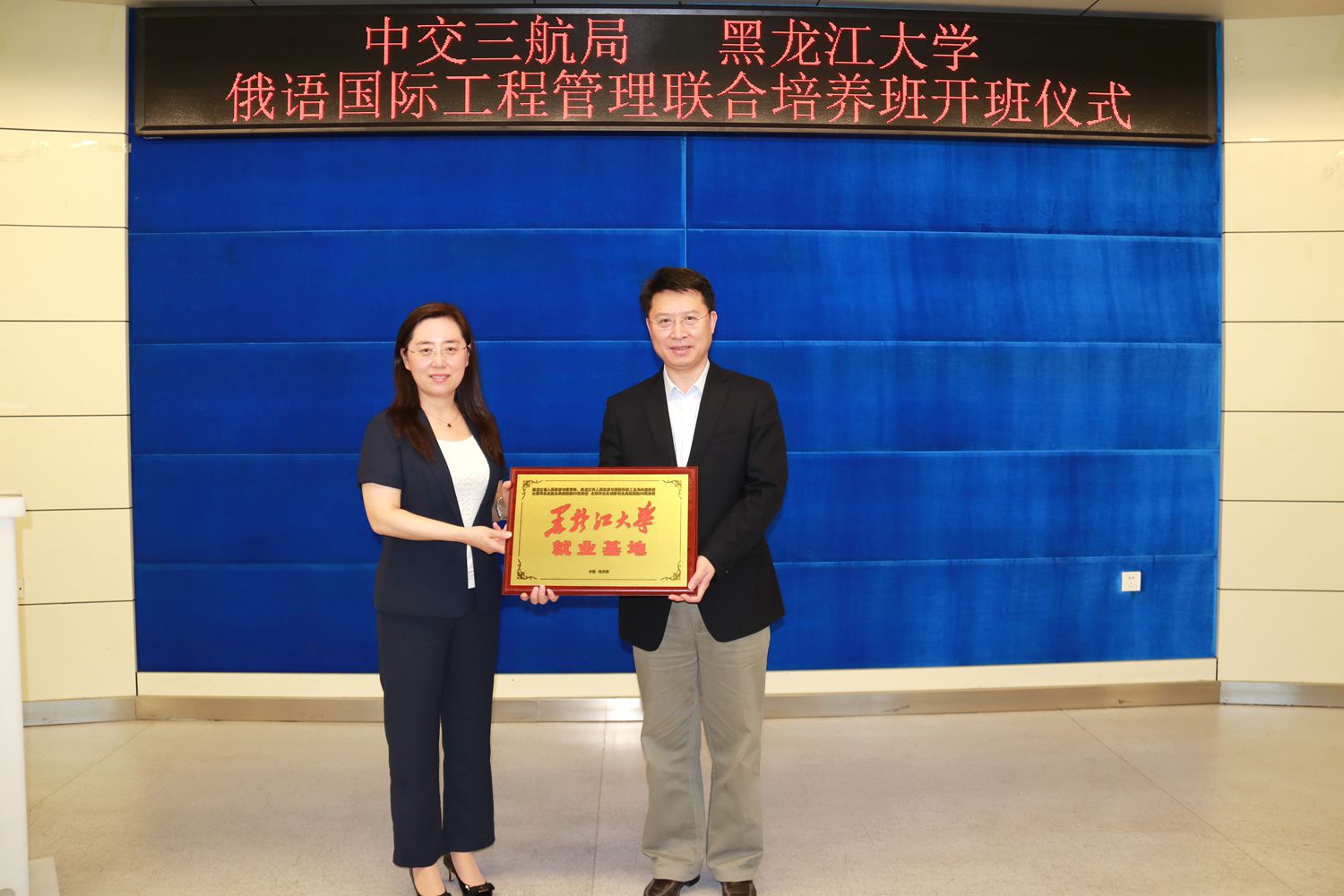 期间,校党委副书记丁宏为中交三航局柏钧部长授予黑龙江大学就业基地铜牌。副校长严明与中交三航局柏钧部长签订黑龙江大学俄语国际工程管理联合培养协议。教务处处长吴华洋和中交三航局海外事业部副总经理张林共同为2020届培养班授予班牌。